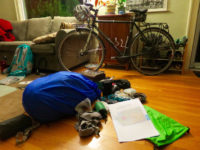 Uhoh… a bike in my living room surrounded by a growing pile of camping gear can only mean one thing: impending adventure! (That backpack’s not coming with me, though: it’s a photobomb leftover from a walk I took this afternoon:) That giant map in the front? It’s Washington! For a …